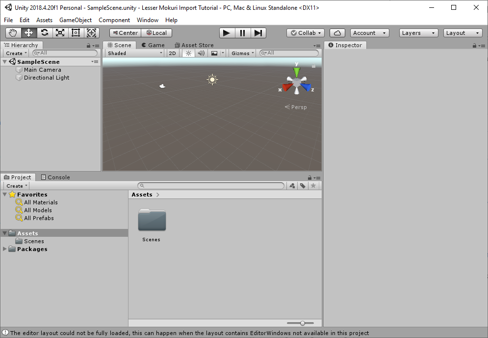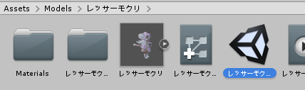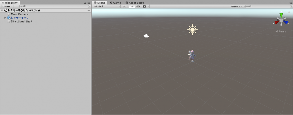Double-click on the Unity scene labelled レッサーモクリ, as highlighted above; the icon (the Unity logo) looks like a cube. You’ll open up the レッサーモクリ scene, and a Lesser Mokuri will pop up in the viewport above!