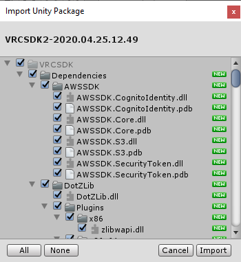 Each time you import a package into Unity, you’ll be asked what you want to import, in a dialog that looks like this. It should have everything selected by default; click Import and let Unity do its thing.