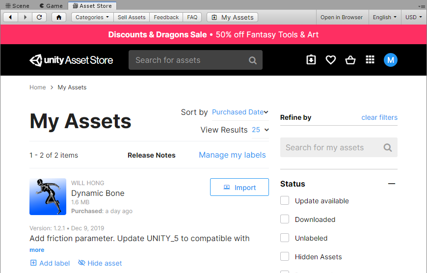 For Dynamic Bone, since it’s a Unity Store asset, click on the Unity Store tab, click on your colored profile circle in the upper-right, and click on My Assets. Alternatively, if you have a copy that you’ve saved separately to your computer, you can follow the above steps.