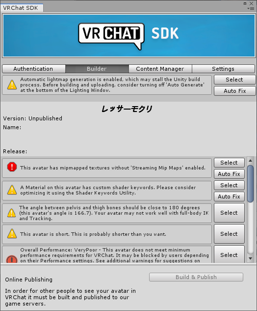 There will be a couple of errors on this page; click on Auto Fix for the first two (don’t worry about the third one), and then click Build & Publish. Unity will process your avatar, and eventually show you this: