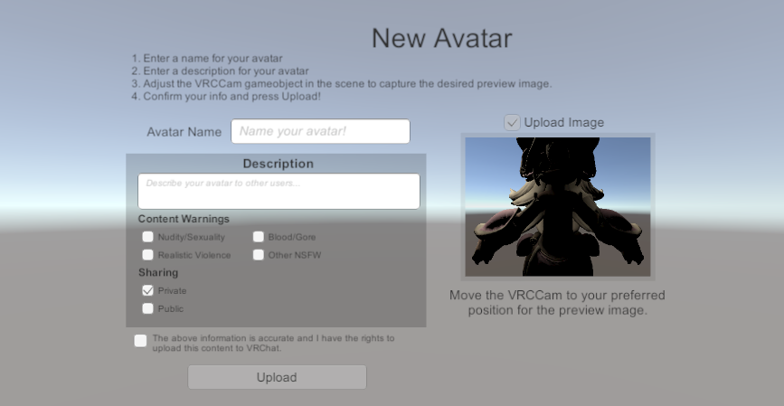 Name your avatar (that’s the name that’ll pop up in VRC), give it a short description, and make sure it’s set to Private (you can easily toggle the Public switch on later).
